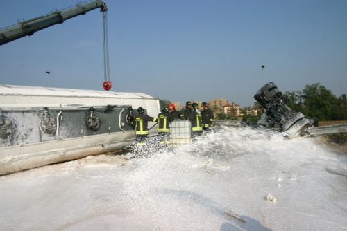 Nel primo pomeriggio di lunedì 21 settembre un’autocisterna con 36 mila litri di carburanti per autotrazione si è ribaltata mettendosi di traverso sulla carreggiata e rovesciando parte del carico. L’incidente si è verificato sulla tangenziale ovest di Milano in direzione Varese all’altezza dell’uscita per Cusago ed ha coinvolto anche un altro veicolo. Tre i feriti condotti in ospedale. I Vigili del Fuoco sono intervenuti con due autopompaserbatoio, quattro autobottepompa (una giunta dalla sede volontaria di Magenta e l’altra da quella di Inveruno), un carroschiuma, un mezzo NBCR (nucleare-biologico-chimico-radiologico), il carro per i travasi, un carro-polisoccorso ed un’autogru. In particolare i volontari inverunesi, che cortesemente ci inviano l’immagine allegata, hanno provveduto a stendere un manto di schiuma estinguente a titolo precauzionale per scongiurare ogni pericolo d’incendio o esplosione. La tangenziale è rimasta chiusa fino alle 21 di ieri.