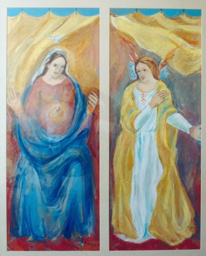 “Nel titolo – ha spiegato l’artista Carlo Farioli – è raccolta la preghiera ‘Ave Maria’, nella quale la Madonna è chiamata a diventare la Madre di Dio e la ‘Benedetta’ tra tutte le donne. Nel dipinto ho voluto raffigurare l’incarnazione di Gesù nel ventre di Maria per renderlo ancor più vicino a tutti gli uomini”.