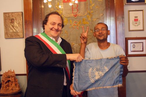 Debasis De, che porta con sé la bandiera delle Nazioni Unite con il permesso di Boutros Ghali, ex segretario generale dell’Onu, è stato ricevuto ieri dal sindaco Gigi Farioli e accompagnato al Tempio civico, luogo cittadino della memoria e della pace.
