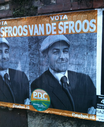 PDC sta per "Partito De Cauboi" e il manifesto invita a votare per il cantautore al Festival di Sanremo.