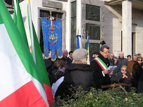 visibili i fori causati dai proiettili dei nazisti – e la deposizione dei fiori, il Sindaco Franco Rudoni ha tenuto il suo discorso ufficiale. Il Primo cittadino ha innanzitutto ringraziato gli intervenuti, in particolare i ragazzi delle scuole dell’obbligo, accompagnati dai loro insegnanti, perché, ha sottolineato, “solo la memoria, il ricordo delle atrocità e degli errori commessi, potranno permettere di non cadere di nuovo nel tragico errore della guerra, e renderanno tutti consapevoli – questo almeno è il nostro auspicio – che la libertà, la democrazia, la pace sono beni vulnerabili ed instabili, da preservare con tutto il nostro impegno”.