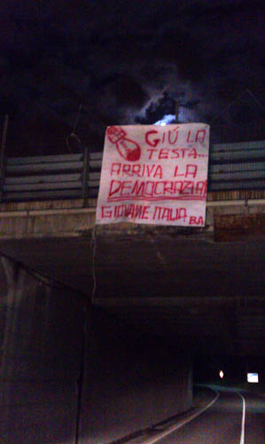 Il circolo bustocco della Giovane Italia appende uno striscione nei pressi della caserma Nato di Solbiate Olona che recita: «Giù la testa, arriva la democrazia»