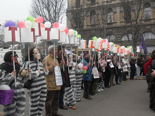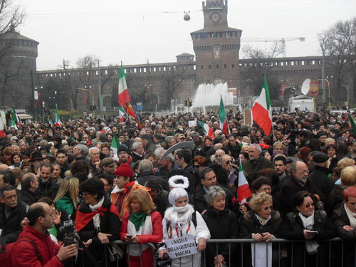la stavano ancora scrivendo». «Mi ricordo -ha continuato- le lacrime di mio padre e mio nonno quando l’hanno letta per la prima volta» scherzando dicendo che «figuratevi che c’era scritto che la repubblica si fonda sul lavoro e la legge è uguale per tutti; oggi sembrerebbe una barzelletta!». E l’affondo al governo continua. «Noi abbiamo un presidente del consiglio che è scemo» e tra gli applausi ha specificato che «solo uno scemo potrebbe credere che una prostituta sia la nipote di Mubarak o dopo un discorso invitare tutti al bunga bunga». E per lottare contro un uomo che «sta sciogliendo la nostra democrazia e sta uccidendo la nostra cultura bisogna difendere la costituzione». Dario Fo, per risolvere la situazione, ha un sogno. «Vorrei svegliarmi una mattina -ha detto- e vedere tantissimi di quegli africani che oggi stanno lottando e morendo per la democrazia arrivare in Italia a liberarci. Vorrei vedere Bossi scappare in Svizzera e sentirmi chiedere “dov’è quello che baciava le mani a Gheddafi?”».Arriva il turno di Salvatore Borsellino. Ci tiene a sottolineare che «oggi ci troviamo in una trincea per difendere la costituzione» che oggi «è a rischio di stupro da parte di un parlamento che è peggio di un mercato bovino in cui molte parlamentari sono scelte nel lettone di Arcore». Sommerso dagli applausi ha concluso gridando che «non permetteremo che la nostra costituzione sia vilipesa: resistenza!». Tra gli ultimi è salito sul palco il professor Nando dalla Chiesa che ha ripercorso la storia di Berlusconi e la giustizia che «ha un qualcosa di fantascientifico». Oggi per il professore «si attacca la scuola pubblica perchè è lì che si insegnano i valori della costituzione e ha ragione Berlusconi quando dice che “i professori inculcano valori contrari a quelli della famiglia” perchè è proprio quello che succede nei quartieri spagnoli di Napoli, allo Zen di Palermo o alla periferia di Milano». Quella di oggi è stata però – parola di Piero Ricca – solo «l’inizio di una grande mobilitazione che ci vedrà scendere in piazza ancora molte volte».