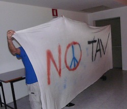 Nel mezzo della seduta, ad animare la serata, c’è stata anche una iniziativa militante dei No Tav locali (soprattutto persone dalle file della Federazione della Sinistra) che hanno srotolato uno striscione contro la grande opera in Val Susa. Il presidente Marco Casillo – che aveva già autorizzato gli agenti della Polizia Locale a lasciare l’aula e a tornare nelle strade per servizio – ha chiesto di ritirare lo striscione: «Credo che il messaggio sia stato ricevuto». I No-Tav ci hanno messo alcuni secondi a ritirare il lenzuolo colorato, questo ha causato proteste dall’opposizione. Giuseppe De Bernardi Martignoni (PdL) ha chiesto di parlare «per fatto personale», ma Casillo non gli ha dato la parola: «Non c’è fatto personale perché non c’è stato dibattito». E così lo stesso esponente del PdL ha abbandonato i banchi dell’opposizione, dando il via ad un successivo, breve dibattito sul’episodio. Lo stesso Martignoni – invitato dal presidente del consiglio – è rientrato poi in aula.