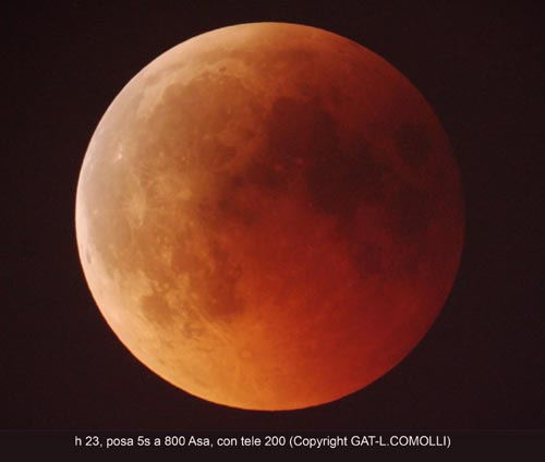 nudo. Il colore della Luna Rossa di ieri sera era indubbiamente molto cupo, ossia la Luna eclissata quasi si confondeva col fondo cielo. Questo ha un significato ben preciso: l’atmosfera della Terra, doveva essere molto poco trasparente ai raggi del Sole che la attraversavano, quindi doveva essere parecchio intasata da polveri. È forte l’impressione che si possa trattare delle polveri del vulcano cileno Puyehue, entrato in parossistica eruzione nei giorni scorsi».Il momento fatidico è comunque arrivato esattamente alla 23:04, quando la Luna è uscita dal cono d’ombra della Terra: sul lato sinistro del nostro satellite si è come accesa una luce fortissima, che ha dato alla scena «un tocco incredibile di tridimensionalità – conclude il presidente dell’associazione -. Il cielo limpidissimo ha permesso a tutti di gustare uno spettacolo davvero grandioso ed emozionante. Grande è stata anche la suggestione offerta da una Luna perfettamente immersa nel paesaggio, dato che la sua altezza non superava i 20°. Per noi del GAT è stata una serata di enorme soddisfazione ma anche di enorme stress: nonostante i tantissimi telescopi le 600 persone presenti non ci hanno lasciato un attimo di pausa. Molto positivo anche il fatto della presenza di moltissimi bambini con i loro genitori: molti hanno ammesso di non aver mai visto né Saturno, nel la ISS, né, tantomeno di aspettarsi dall’eclisse un’emozione così grande».