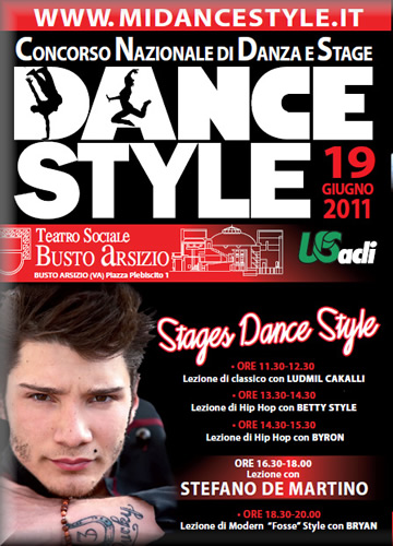 Domenica 19 giugno di nuovo spazio alla musica sul palco del teatro di piazza Plebiscito, che a partire dalle 10 e per tutta la giornata ospita il concorso nazionale di danza e stage “Dance Style”. La manifestazione, promossa dall’Us Acli Milano, vedrà la partecipazione di importanti protagonisti del mondo della danza come Stefano De Martino, Brian Bullard, Betty Style, Byron, Ivan$, Anna Rita Larghi, Comasia Palazzo, Virgilio Pitzalis, Ludmill Cakalli, Tania Sulejmani e Antonio Ruggiero. Si tratta di una “prima volta” a Busto Arsizio dopo l’edizione pilota svoltasi nel maggio 2010 all’Idroscalo di Segrate. Tre i concorsi principali, a cui parteciperanno scuole di danza provenienti da tutta Italia: “Classic Time”, “Hip Hop Zone” e “Modern Contact”, entrambi suddivisi in tre sezioni (Junior Under 13, Junior Under 18 e Senior). Tra una premiazione e l’altra le esibizioni di artisti e ballerini internazionali, molti dei quali terranno anche lezioni collettive a pagamento e su prenotazione. L’ingresso alla manifestazione ha un costo di 10 euro per ogni sessione; a chi volesse partecipare a due o più sessioni verrà praticato uno sconto del 50% sui biglietti successivi al primo. “Dance Style” vivrà anche un’anteprima sabato 18 giugno a partire dalle 17.30 nella palestra di via XXV aprile, mentre nella giornata di domenica anche il palazzetto dello sport di Castellanza ospiterà due lezioni (dalle 11 alle 12.30 e dalle 13.30 alle 15) con Stefano De Martino.