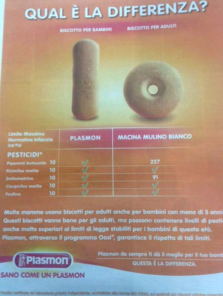 Date i biscotti da grandi ai vostri bambini? Ma siete pazzi! Sono pieni di pesticidi, soprattutto quelli del Mulino Bianco…Accidenti, la Plasmon ci è andata pesante questa mattina (1° dicembre) sul Corriere della Sera. Ha attaccato pesantemente la Barilla dicendo, in poche parole, che i suoi prodotti non sono adatti ai bambini. Si chiama pubblicità comparativa e da un po’ di tempo a questa parte è del tutto legale. Ma poche pagine dopo la Barilla passa al contrattacco. Un paginone intero ci fa sapere che possiamo stare tranquilli: "Le mamme italiane sanno quello che fanno" e i loro prodotti sono super controllati. Plasmon, sostiene Barilla, ha quindi fatto un attacco solo per confondere i consumatori. Eggià, ci sono riusciti.