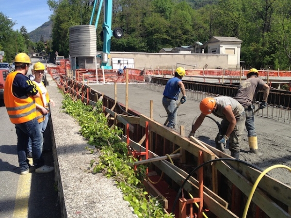 Proseguono i lavori al Ponte della Rasa. Oggi sono stati posati i 110 metri cubi di calcestruzzo necessari per la soletta che costituirà il nuovo piano viabile della struttura.