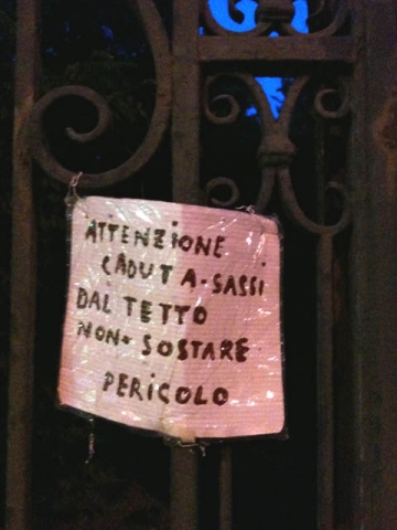 Un cartello posizionato sopra un bel cancello antico avvisa, in via Castiglioni che dal tetto di un palazzo antico si è staccato un pezzo di cornicione.