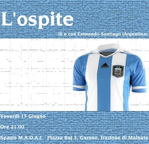 Uno spettacolo “universale”, pronto ad essere riproposto in ogni parte del mondo, al di là o al di qua dell’Oceano. Venerdì 15 giugno alle 21 allo spazio Madai di Gurone (piazza Baj) sul palco tornerà Fernando Santiago, attore argentino che ripropone a distanza di sei anni dall’ultima volta lo spettacolo “L’ospite”, scritto con Gustavo Vallejos, nell’ambito della rassegna "Teatro senza frontiera" voluta e ideata dal Progetto Zattera.