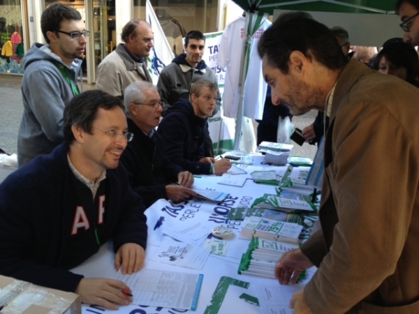 «Ci eravamo sistemati come sempre in Piazza Monte Grappa. Sono arrivati i vigili urbani e ci hanno contestato che dovevamo metterci in via Marconi e così ci siamo dovuti spostare». A parlare è Fabio Binelli, assessore comunale e storico militante del Carroccio, che a testa bassa continua a raccogliere firme per i referendum promossi dalla Lega in Lombardia contro l’Imu, l’euro e per chiedere che resti sul territorio almeno il 75% dei soldi delle tasse versate. «In questo modo – dice un militante – la Lombardia avrebbe 42 miliardi in più rispetto ad oggi». Molti i cittadini presenti per firmare, tra questi anche il sindaco di Varese Attilio Fontana. La Lega attacca non solo sul fronte delle tasse, ma anche su quello delle pensioni di invalidità, della spesa delle regioni, della spesa pubblica e sul sistema paese in generale.