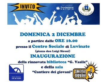 Nonostante e in risposta alla crisi, investire sulla cultura e sulle politiche giovanili. È questa la scommessa dell’amministrazione comunale di Luvinate, che domenica 2 dicembre aprirà ai cittadini le porte della rinnovata biblioteca “G. Vasile” e della nuova sala “Cantiere dei giovani”, con un pomeriggio ricco di appuntamenti.