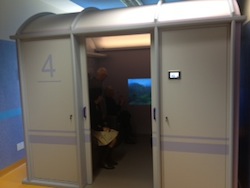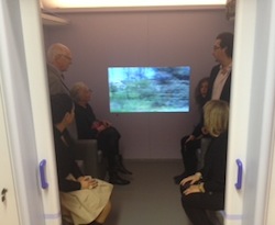 La delegazione greca e la dottoressa Egedius hanno visitato la 3SG insieme al vicepresidente dott. Benedettino Soldavini, al direttore generale Manila Leoni e allo staff del " treno", insieme al dottor Ivo Cilesi, psicoterapeuta. Fulcro del complesso di servizi del “Treno della Memoria” , è proprio il “Therapeutic Train”: un vero e proprio scompartimento di treno, ricostruito così come se fosse reale, con posto per 4 passeggeri (foto a destra e qui sotto). L’idea è stata quella di rappresentare un habitat che diventa spazio terapeutico: sul monitor, inserito al posto dei finestrini, grazie ad un