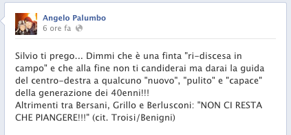 E se ieri toccava al centrosinistra, ora tocca al PdL, con l’auspicio che la «ri-discesa in campo» sia tutta una finta. «Altrimenti tra Bersani, Grillo e Berlusconi: "Non ci resta che piangere!», conclude Palumbo.