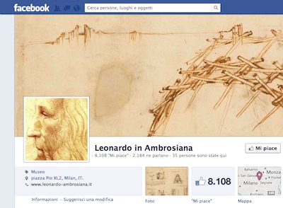 Leonardo Da Vinci è su Facebook e i suoi disegni hanno già ottenuto più di ottomila “mi piace”. La pagina “Leonardo in Ambrosiana“, creata da pochi giorni in occasione delle esposizioni dedicate al Codice Altantico è una sorta di guida “social” dedicata al genio vinciano. Al suo interno si possono trovare le immagini delle opere, dei frammenti del codice atlantico oltre a contenuti di approfondimento e notizie. «Il nostro obiettivo – ha spiegato Giorgio Recchebuono, presidente della Fondazione Cardinale Federico Borromeo – è quello di rendere noto al pubblico il patrimonio culturale in mostra alla Biblioteca Ambrosiana». Dalla pagina Facebook si può inoltre accedere al sito dedicato al Codice Atlantico, la più ampia raccolta di disegni, scritti e appunti di Leonardo. L’opera è conservata dal 1637 all’interno della Veneranda Biblioteca Ambrosiana di Milano. Nel 2008 il Collegio dei Dottori dell’Ambrosiana, presieduto dal Prefetto Monsignor Franco Buzzi, e in sinergia con la Fondazione Cardinale Federico Borromeo, decide di avviare un’epocale operazione di sfascicolatura dei 12 volumi del Codice e il posizionamento dei singoli fogli all’interno di passepartout appositamente studiati per garantirne la migliore conservazione e allo stesso tempo per facilitarne l’esposizione.