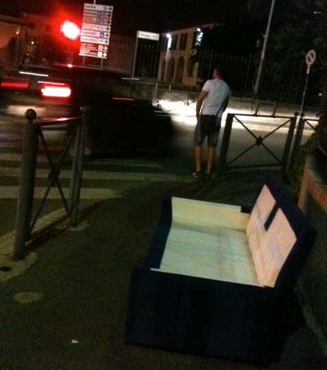 Un divano abbandonato nella centralissima via Verdi, angolo via Sanvito. Così appariva questa notte, adagiato sul marciapiede all’incrocio fra le vie.
