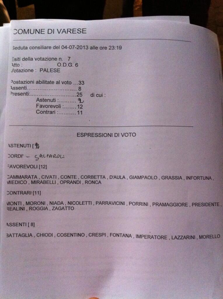 Per la precisione, il consiglio ha votato a favore del punto uno della mozione presentata dai consiglieri comunale del Partito Democratico, che chiedeva l’abolizione del pagamento forfetario di 1 euro, dalle 20 alle 24, negli stalli delimitati da strisce di colore blu. Alcuni consiglieri hanno votato in maniera eccentrica rispetti ai gruppi. Il sindaco Fontana non era presente. Il Pdl ha annunciato il voto a favore dell’abolizione della tariffa, ma il consigliere Pramaggiore ha votato contro insieme alla Lega, il consigliere Galparoli si è astenuto, e sono risuolati fuori aula i consiglieri Battaglia, Chiodi, Cosentino, Crespi. L’Udc non ha votato, con Morello e Imperatore assenti. Mentre Movimento libero ha votato contro. A favore il 5 stelle con Cammarata, e tutto il Pd guidato dal capogruppo Mirabelli, più Ronca della lista civica. Si è astenuto Cordì di Sel. Di seguito la foto postata su twitter dal consigliere Andrea Civati con l’esito del voto.