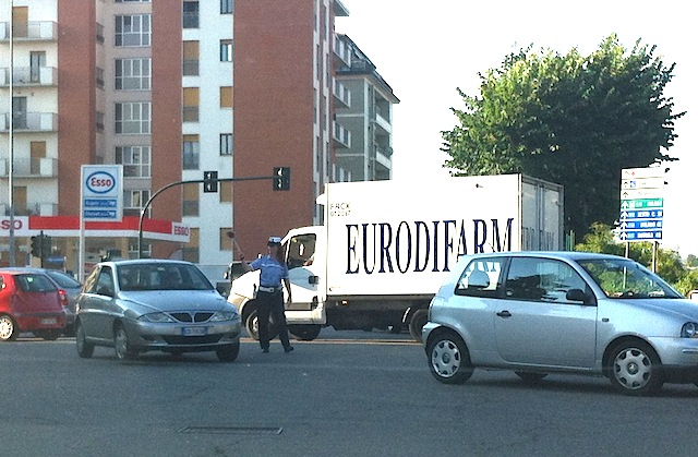 A regolare il traffico, nella prima mattina di giovedì 11 luglio, una vigilessa con tanto di paletta: i semafori nel cosiddetto "incrocio dell’autostrada" alle porte di Varese erano in tilt, con conseguente traffico congestionato e la necessità di un "ritorno all’antico". (Foto Sergio Raos)