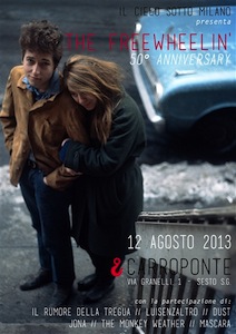 Il Cielo sotto Milano, in collaborazione con CarroPonte, presentano una serata dedicata a quello che per molti è l’uomo a cui rendere grazie, sempre e comunque. L’idea è quindi quella di celebrare il grande maestro con una serata unica, in cui, per l’occasione, si festeggerà il 50° anniversario di uno dei suoi capolavori: The Freewheelin’ (Columbia Records – 1963). Durante la serata si alterneranno infatti sul palco DUST, Il rumore della tregua, MasCara, The Monkey Weather, Luisenzaltro e Jona che eseguiranno l’intera tracklist dell’album nel preciso ordine con cui è stato pubblicato nel lontano 1963. Il tutto sarà contornato anche da bellissimi contenuti aggiuntivi quali immagini riguardanti Bob Dylan che verranno proiettate sul palco e accompagnate, nei cambi palco, da estratti esclusivi di interviste e versioni differenti dei brani contenuti nell’album.