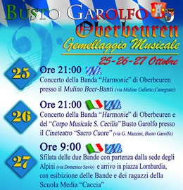 Sabato 26 ottobre, ore 21: concerto della banda "Harmonie" di Oberbeuren e del corpo musicale Santa Cecilia al cineteatro Sacro Cuore in via Mazzini a Busto Garolfo;