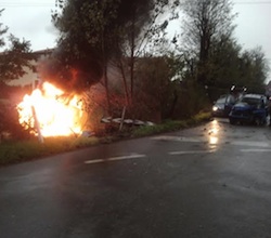 Insospettiti dal loro atteggiamento gli agenti hanno deciso di procedere all’identificazione dei passeggeri che, però, appena se ne sono accorti, si sono dati ad un fuga rocambolesca in automobile. Un corsa folle e pericolosissima: dopo alcuni chilometri, infatti, i fuggitivi, dopo aver evitato uno scontro con un autocarro, hanno perso il controllo del veicolo e si sono schiantati con un’altra auto che viaggiava in senso opposto. L’Alfa Romeo si è ribaltata terminando la corsa in un campo e prendendo fuoco. Immediatamente gli agenti si sono lanciati nel soccorso dei fuggitivi traendoli in salvo.