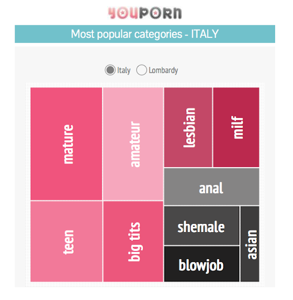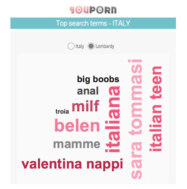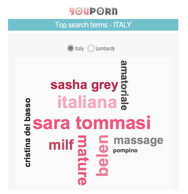 Nato come "social network" di condivisione del porno "ispirato" da Youtube, Youporn è uno dei giganti a luci rosse del mondo: è il 4° sito più visitato al mondo e il 1° in Europa in assoluto. In Italia ha 1.590.000 visite ogni giorno, di cui appena meno di un decimo (152mila) vengono dalla Lombardia (nella foto: l’ironico cartello dei Giovani Padani, nei giorni dello scandalo dei diamanti che coinvolgeva il tesoriere leghista Belsito). Il gigante del porno pubblica spesso statistiche, confrontando a volte anche i comportamenti diversi esistenti in diverse nazioni o continenti: l’Italia è tra i principali "consumatori" (il sito è gratuito, alimentato da pubblicità di prodotti a pagamento), Milano e Napoli sono tra le città dove ci si connette di più, la ex showgirl Sara Tommasi è tra le attrici più ricercate. Tra le statistiche che Youporn elabora non mancano quelle curiose, come quelle che calcolano le variazioni delle visite nei giorni di grandi eventi (come le finali sportive o la presentazione in Inghilterra del Royal Baby)