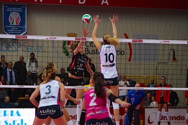 Stavolta non c’è proprio bisogno di iperboli o drammatizzazioni: quella di sabato 8 marzo sul campo di Novara è davvero una sfida da “dentro o fuori” per la Unendo Yamamay, senza se e senza ma. La vittoria a Frosinone nel turno infrasettimanale ha portato la Igor Gorgonzola a più 4 su Busto Arsizio, e con un ulteriore passo falso nello scontro diretto le biancorosse precipiterebbero a meno 7 dal quinto posto: un gap davvero difficile da colmare a soli cinque turni dalla fine della regular season, soprattutto considerando che Arrighetti e compagne devono ancora affrontare tre “big” come Piacenza, Modena e Conegliano. Fare risultato nel derby del Ticino diventa dunque imperativo, ma non sarà una passeggiata: già all’andata Busto si impose con un sofferto 3-2 (nella foto) e da allora il rendimento della squadra di Pedullà è ulteriormente migliorato, soprattutto in casa, dove le novaresi hanno conquistato quattro vittorie di fila. Ma il problema, come si sa, è in massima parte interno: la Unendo Yamamay deve ancora ritrovarsi nel morale e nella tattica dopo la scoppola di Coppa Italia, dandosi al più presto un assetto stabile e senza potersi permettere di attendere l’innesto di Sloetjes, che comunque per la prima volta sarà a disposizione di Parisi almeno per la panchina. La partita di sabato, che avrà inizio alle 20.30, sarà trasmessa anche su Rai Sport 1: chissà che la tv nazionale non possa dare un aiuto, visto che anche la partita d’andata passò in diretta e che l’ultima apparizione delle farfalle davanti alle telecamere (almeno in campionato) è coincisa con il sorprendente 3-0 su Piacenza…