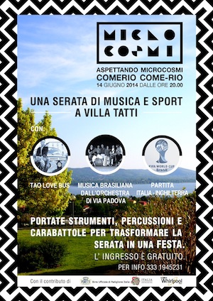 Perchè la serata, in realtà, prende il nome di "Aspettando Microcosmi" e anticipa la seconda edizione del festival che si terrà il 13, 14 e 15 settembre 2014 a Comerio. «Abbiamo spostato la data del festival a settembre e la serata di sabato vuole essere un assaggio di ciò che si potrà trovare – spiega Vittorio Cosma, direttore artistico del festival –. Vogliamo riportare a Comerio tre giorni di musica, incontri, arte continuando sull’onda della multidisciplinarità dell’anno scorso e coinvolgendo tutto ciò che di bello c’è sul territorio. Il nostro leitmotiv sarà la trasversalità e l’inclusività». La serata di sabato 14 giugno, oltre ad essere l’occasione per guardare la partita dei Mondiali sotto il cielo stellato, sarà quindi l’occasione per sostenere la nuova edizione del festival "Microcosmi". Tutto ciò che viene raccolto durante la serata, servirà a finanziare l’edizione di settembre e a dare l’opportunità, anche quest’anno, di far vivere 3 giorni di incontri, concerti, laboratori per adulti e per bambini, letture e spettacoli, in cui i protagonisti sono realtà locali e nazionali, in diretto contatto con il territorio.