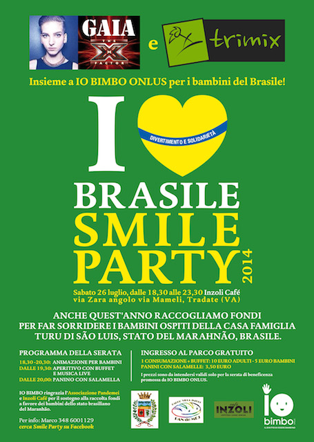 "I love Brasile – Smile Party" è la festa di beneficenza che si terrà sabato 26 luglio nella cornice di Villa Inzoli, in collaborazione con il comune di Tradate, organizzata dall’associazione "Io Bimbo". Dalle 18.30 è prevista animaizone per bambini, mentre alle 19.30 ci sarà l’aperitivo con buffet e misica live. Aperto anche lo stand gastronomico con panino e salamella. Il tutto ha come obiettivo la raccolta fondi da parte dell’associazione "Io Bimbo" «per far sorridere gli ospiti della casa famiglia Turu di Sao Luis, stato del Marahnao, Brasile».