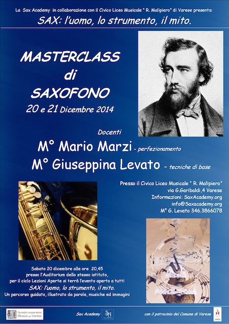 L’Ensemble de Saxophones del Civico Liceo Musicale di Varese, organizza per il fine settimana del 20 e 21 dicembre una Masterclass di Saxofono in occasione del bicentenario di Sax e del decennale di fondazione del gruppo. Si esibirà in concerto sabato sera alle 20.45 presso l’Auditorium del liceo.Fra i docenti sarà presente il saxofonista di fama internazionale Mario Marzi.