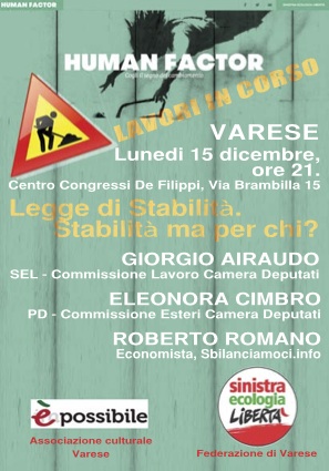 Sinistra Ecologia e Libertà Varese e l’Associazione “Varese Possibile” (lanciata da Giuseppe Civati, PD) organizzano lunedì 15 dicembre, alle ore 21.00, presso il “Collegio De Filippi di Varese” un incontro pubblico dal titolo “Legge di Stabilità. Stabilità per chi?”. Saranno presenti Giorgio Airaudo, deputato di Sinistra Ecologia e Libertà, Eleonora Cimbro deputata del Partito Democratico e Roberto Romano, Economista della rete “Sbilanciamoci”.«Parleremo della legge di stabilità in discussione in queste ore in Parlamento, di Europa e delle ripercussioni sul lavoro e sui lavoratori della recente approvazione del “Jobs Act” – spiegano gli organizzatori -. Sono numerose le perplessità che condividiamo rispetto ai temi citati. Siamo convinti che non se ne sia discusso abbastanza e che attraverso il dialogo si sarebbero potute trovare soluzioni differenti, sia per quanto riguarda il Jobs Act che per quanto riguarda la legge di stabilità. Perché, per fare un esempio, è un tabù parlare di povertà e di reddito minimo garantito? Esiste in tutta Europa, tranne che in Ungheria, Grecia e Italia, ovviamente. Ma discuterne, da noi, è vietato».