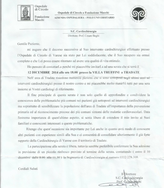Una donna morta in ospedale lo scorso febbraio, ha ricevuto  una lettera dal primario del reparto di cardiochirurgia, a novembre, che sa di beffa: “Gentile paziente, mi auguro che il decorso successivo al suo intervento cardiochirurgico presso l’ospedale di Varese sia stato soddisfacente, che il suo recupero sia completo e che lei sia ritornata a una vita normale”.