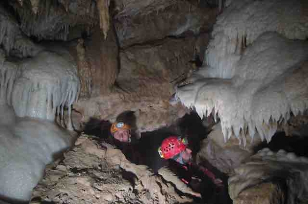 L’inizio della spedizione. Alle 9.30 di sabato 29, verificato il materiale da portare in grotta e stabilito il contatto-radio, inizia la discesa verso il campo base a circa -400 metri. Dopo sole tre ore di progressione superando strettoie, meandri, pozzi e alcuni saloni il campo è stato raggiunto con successo e, una volta attrezzato e verificato il fondamentale collegamento radio, il gruppo riparte alla volta del fondo.
