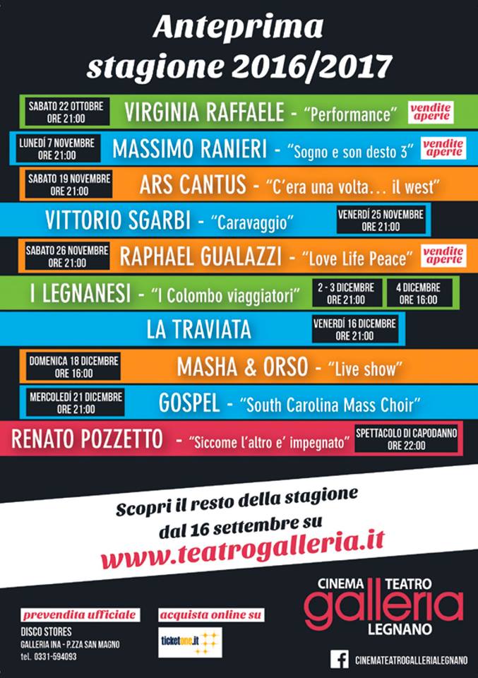 Tra i grandi nomi spiccano quelli di Massimo Ranieri il 7 novembre e Rapahael Gualazzi il 26 novembre mentre a “I Legnanesi” sono state riservate addirittura 3 date (2-3-4 dicembre). Per i più piccoli imperdibile l’appuntamento del 18 dicembre con Masha e Orso. Non mancheranno spettacoli di cabaret (uno dei punti forti della programmazione del Galleria, ndr) con Giuseppe Giacobazzi, Maurizio Battista, Angelo Pintus mentre si sperimenterà anche il teatro di attualità con Vittorio Sgarbi e il suo “Caravaggio” o Federico Buffa con “Le Olimpiadi del ’36”.