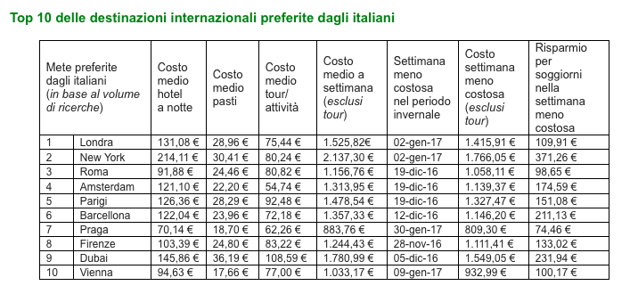 Londra in testa ma anche New York, Roma e Amsterdam: sono le destinazioni di tutto il mondo preferite dagli italiani nel periodo invernale (dicembre 2016 – marzo 2017) e il costo medio di un soggiorno di una settimana comprensivo di hotel e pasti.