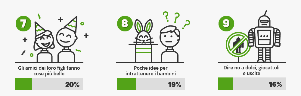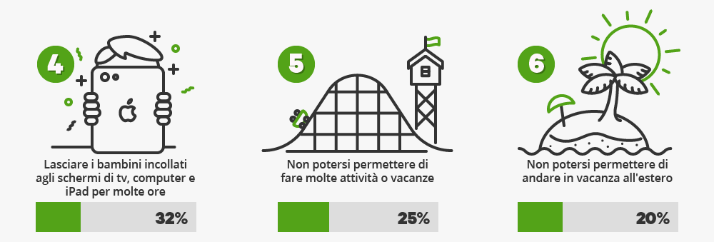 Alle pressioni causate dai social media, si aggiungono poi i sensi di colpa dovuti dal poco tempo che i genitori hanno a disposizione per stare con i propri figli (42%), quelli causati dal tempo che i bambini passano al chiuso (28%) o davanti alla TV (24%), e quelli causati dalla mancanza di attività da fargli fare (18%).