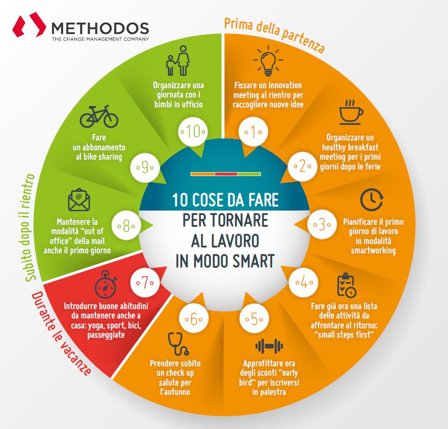 Secondo Maria Vittoria Mazzarinni, esperta di Methos Italia, questa sensazione si può combattere con lo smartworking. «Smartworking – spiega l’esperta – vuol dire gestire la dimensione lavorativa e personale in modo intelligente, con l’obiettivo di trovare il benessere e la produttività in entrambe». Methos Italia è una società di consulenza che affianca le aziende nei processi di change management. Le ferie sono un’ottima opportunità per “ricaricare le batterie” e ritornare al lavoro pieni di energia. È per questo che Maria Vittoria Mazzarini ha stilato una serie di consigli da seguire prima, durante e dopo le vacanze, per affrontare il rientro in ufficio al meglio.