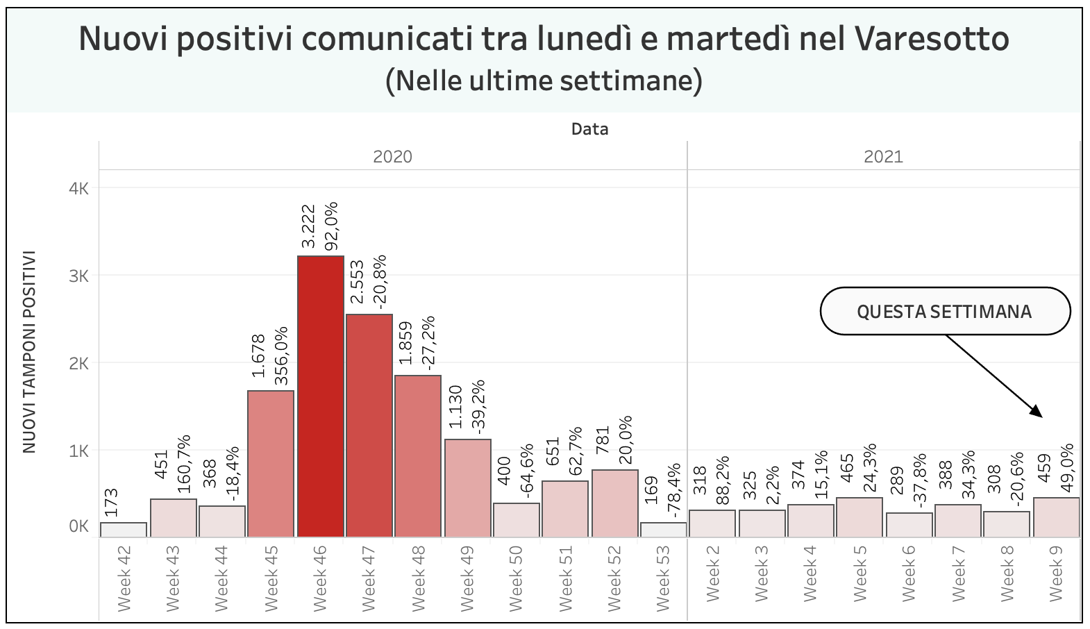 Vista l’oscillazione del numero di tamponi comunicati quotidianamente, che non è mai uniforme nei giorni della settimana, abbiamo costruito una visualizzazione che permette di confrontare i dati comunicati giorno per giorno con quelli degli stessi giorni della settimana precedente. In provincia di Varese quelli comunicati tra lunedì e martedì della settimana scorsa erano 308 questa settimana sono 459. È il 49% in più.