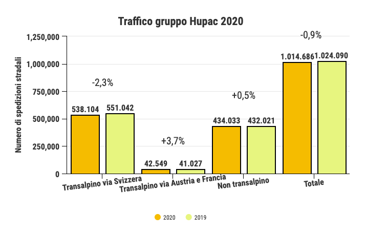 Con circa 1 milione di spedizioni stradali il Gruppo Hupac, che ha un importante terminale interzonale anche tra Gallarate e Busto Arsizio, è riuscito a mantenere i volumi di traffico al livello dell’anno precedente. Tuttavia, a causa della crisi coronavirus, lo sviluppo è rimasto al di sotto delle aspettative.