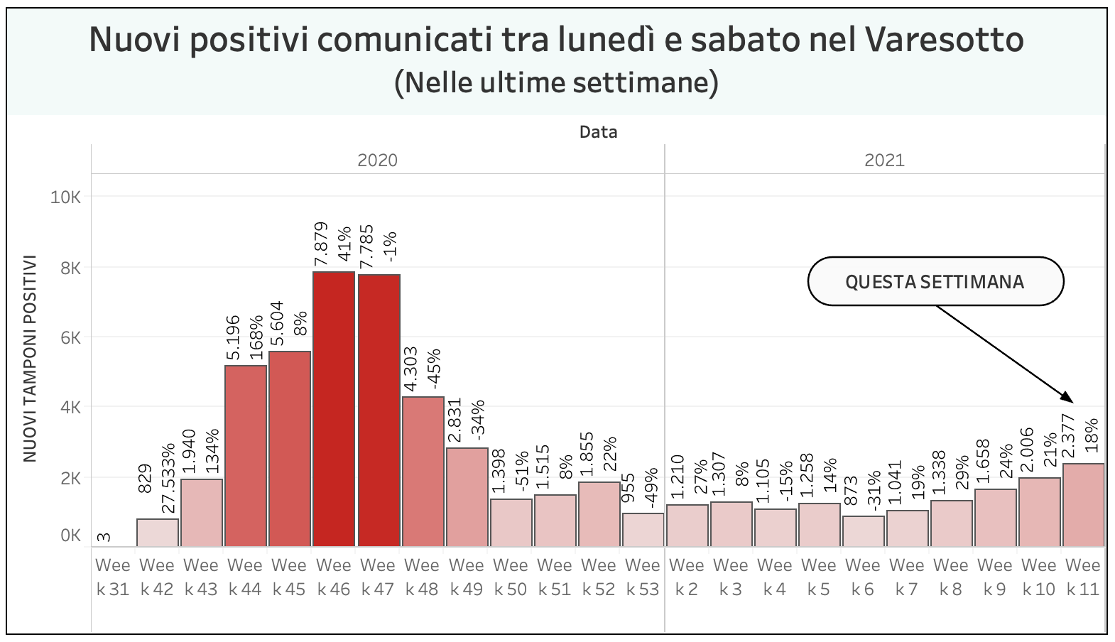 Vista l’oscillazione del numero di tamponi comunicati quotidianamente, che non è mai uniforme nei giorni della settimana, abbiamo costruito una visualizzazione che permette di confrontare i dati comunicati giorno per giorno con quelli degli stessi giorni della settimana precedente. In provincia di Varese quelli comunicati tra lunedì e venerdì della settimana scorsa erano 2006 questa settimana sono 2377. È il 18% in più.