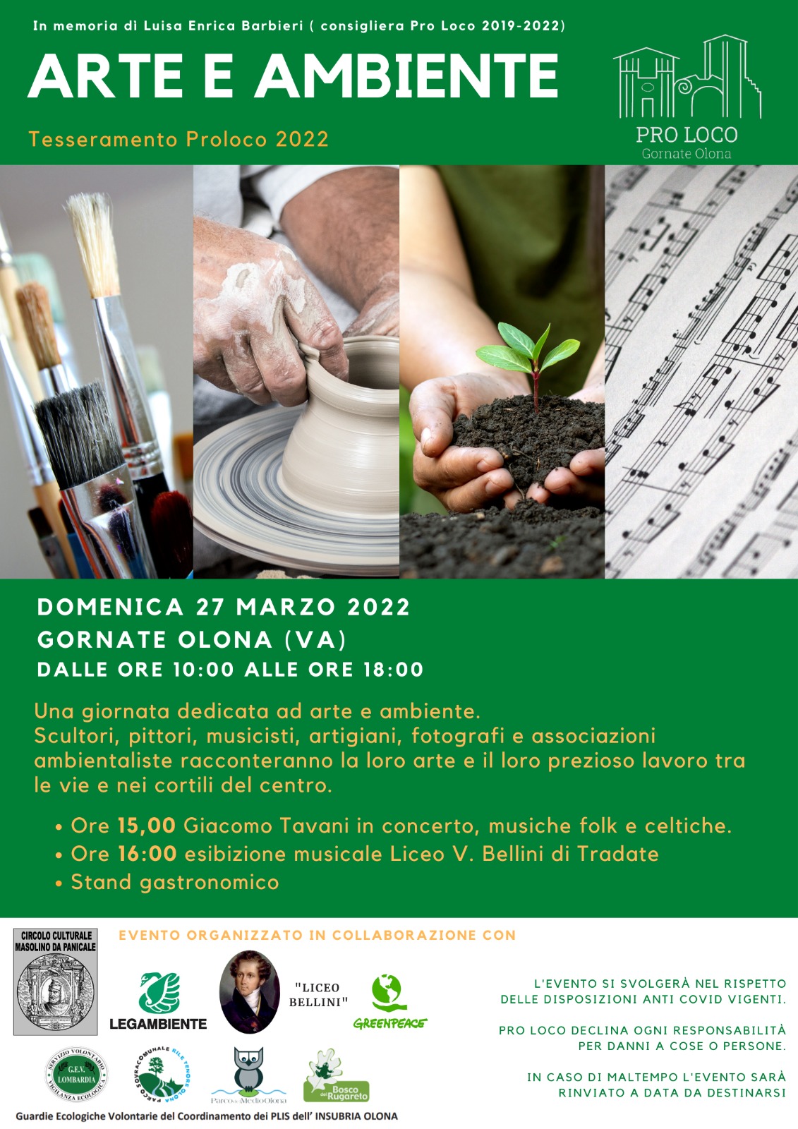 A partire dalle 10 e fino alle 18 tanti momenti interessanti: pittori, scultori, musicisti e associazioni ambientaliste animeranno le vie del centro. Ci sarà uno stand gastronomico e alle 15 musica folk e celtica dal vivo con il concerto di Giacomo Tavani. Alle 16 di esibiranno gli allievi del Liceo musicale Bellini.